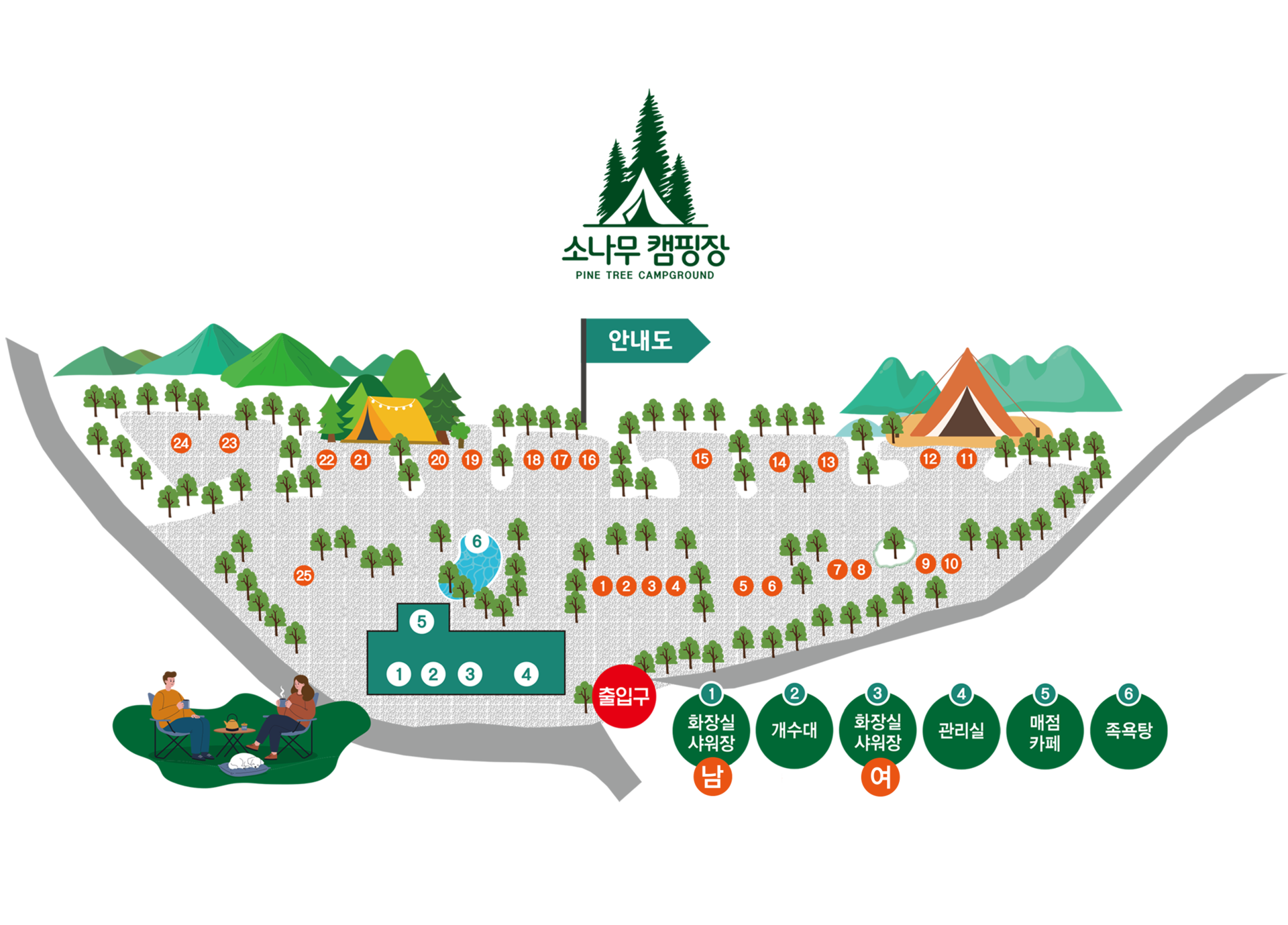 사이트 넘버 | 21 | 22 | 23 | 24 | 25 | 8번, 9번, 10번 사이트는 고정텐트 자리로 텐트 대여하는 고객들만 이용가능. | ||||